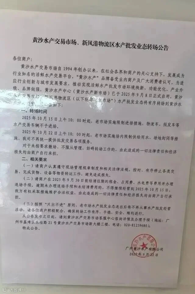 在旧黄沙水产市场经营的商户告知记者,7日收到《关于水产批发业态转场经营》的通知,提到黄沙水产中心(下称“新市场”)已于2025年9月8日正式启用,黄沙水产交易市场、新风港物流区(下简称“老市场”)水产批发业态将于10月15日开始实施限制进场措施,老市场不再从事水产批发经营活动,统一转场到新市场经营。