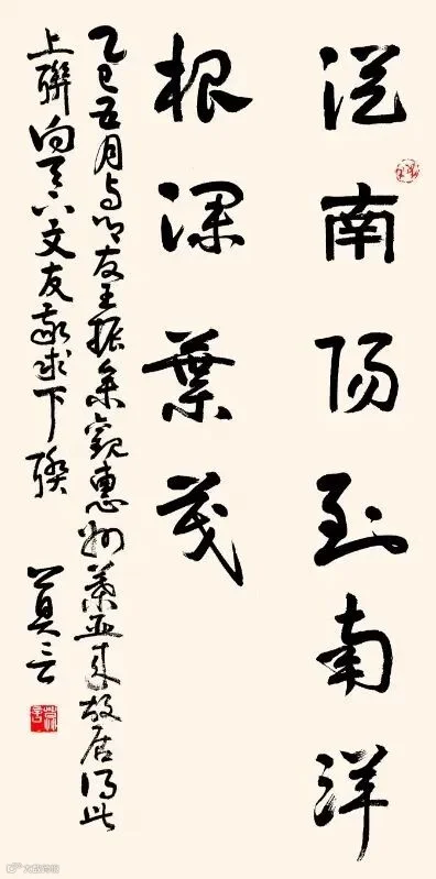 莫言所出上联中的“南阳”源于惠州叶姓家族来自河南南阳,其堂号为“南阳堂”,而“南洋”是说叶亚来下南洋到吉隆坡发展成就大业,“叶”指的是叶氏家族。“南阳”与“南洋”是完全同音的一对平声字,但“阳”与“洋”同音不同字,“根深叶茂”形容叶姓家族从河南南阳到广东惠州,再到吉隆坡之繁茂昌隆的状态,也象征中华文化的根系之深与影响之广。