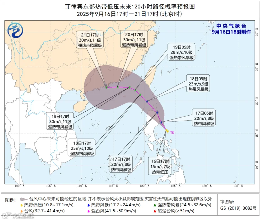 中央气象台9月16日18时对菲律宾以东热带低压的路径和强度预报