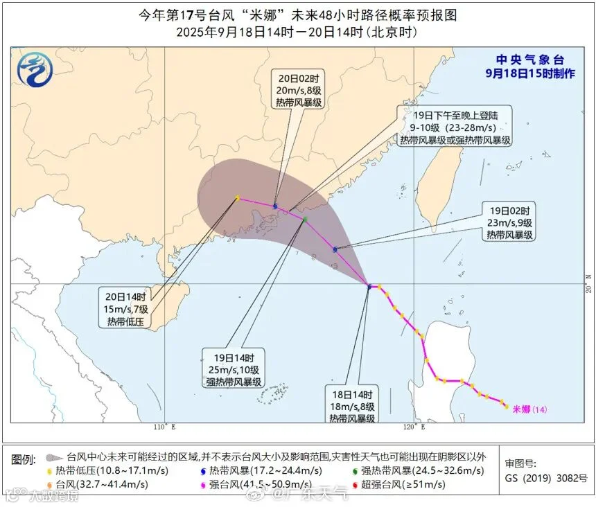 预计,“米娜”将以每小时15-20公里的速度向西北方向移动,强度逐渐增强,将于19日中午至夜间以热带风暴级或强热带风暴级(9-10级)登陆广东中东部沿海地区,登陆后继续向西北方向移动,强度逐渐减弱。