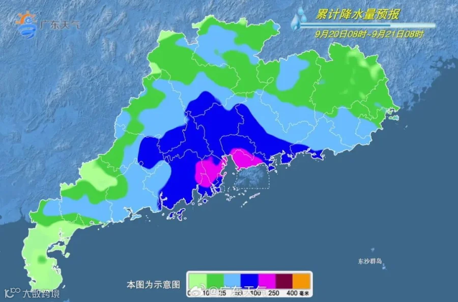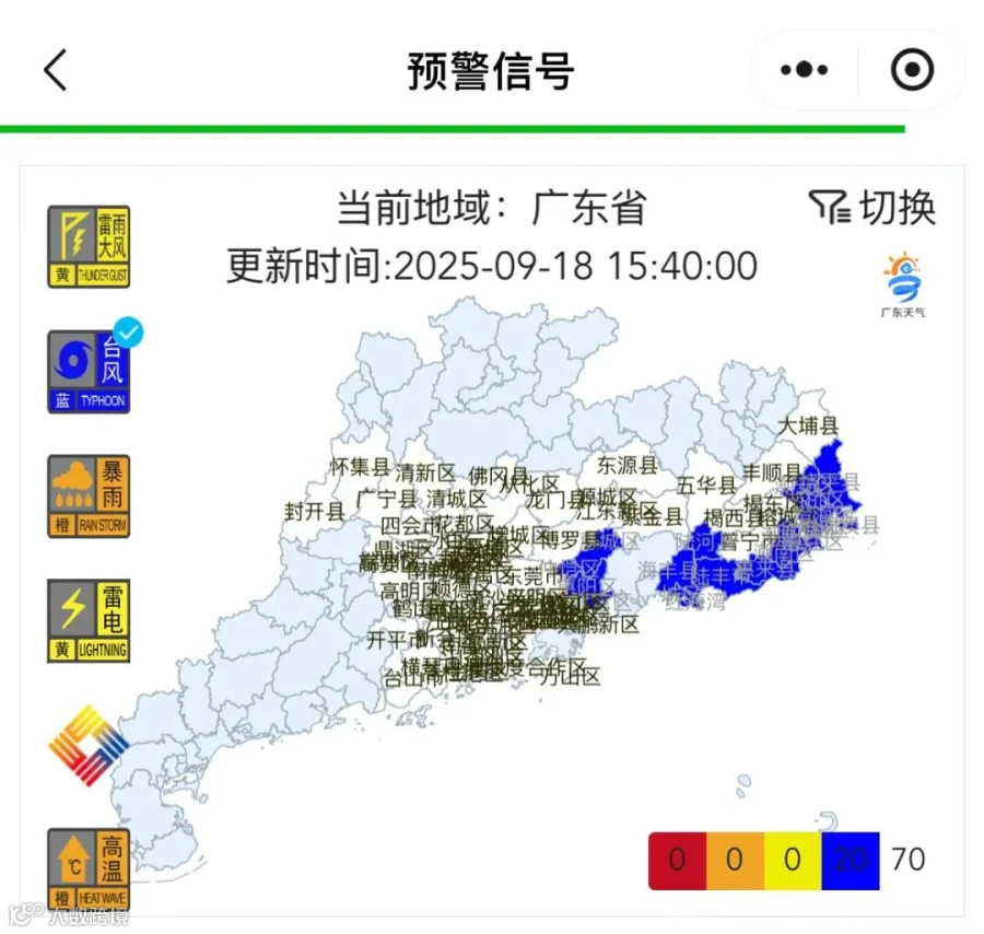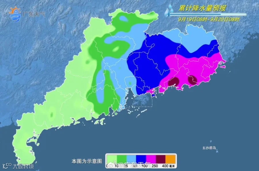 19日,粤东市县、河源和惠州阴天有暴雨到大暴雨局部特大暴雨,梅州、广州、东莞、深圳有大雨到暴雨局部大暴雨,其余市县多云,有(雷)阵雨局部暴雨,雷雨时阵风8~11级。最高气温:河源、梅州、惠州和粤东市县28~32℃,其余市县33~36℃。