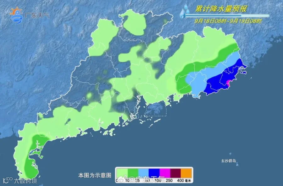 受台风影响,18-19日,南海北部海面和广东中东部海面风力自东向西加大至7~9级阵风10~12级;19-20日,广东有一次暴雨到大暴雨局部特大暴雨过程(面上80-120毫米,最大350-400毫米),中东部沿海市县有7~10级阵风。