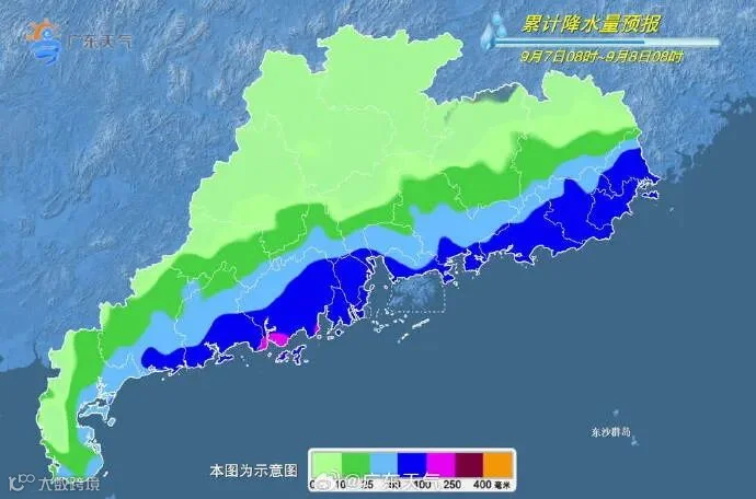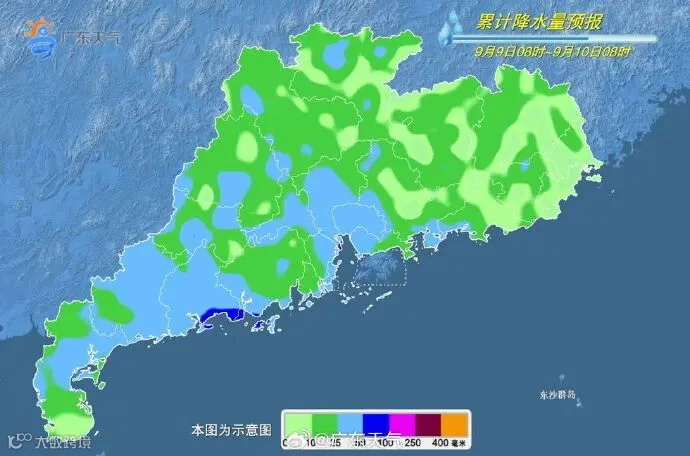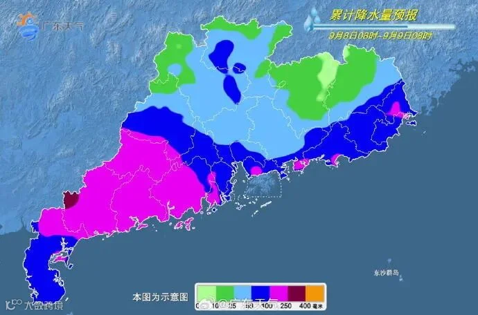 8-9日,珠三角南部和粤西市县有暴雨到大暴雨局部特大暴雨(面上80~150毫米,最大累积雨量350毫米左右),粤东市县有大雨到暴雨局部大暴雨,其余市县有(雷)阵雨局部暴雨。最高气温:粤北市县32~34℃,其余市县28~32℃。
