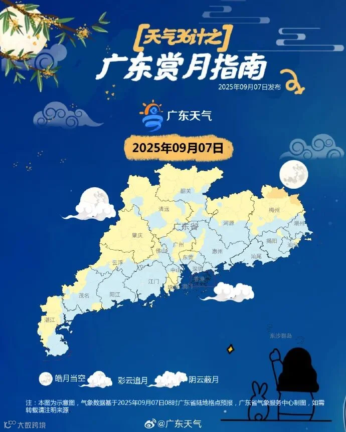 今天(9月7日)夜间,受台风外围云系影响,广东的南部市县云量较多,可能会错过月全食,中北部相对好一些,有机会看到彩云追月。