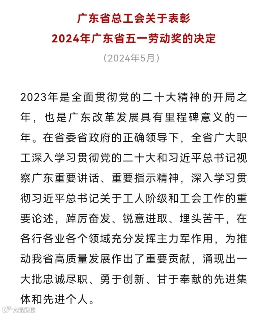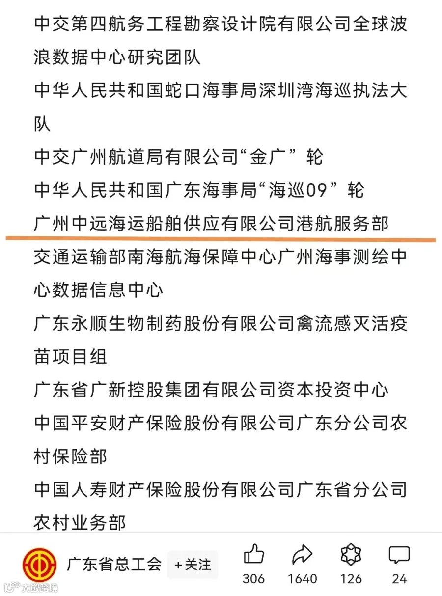 5月17日广东省总工会发布《关于表彰2024年广东省五一劳动奖的决定》,供应公司港航服务部被授予“广东省工人先锋号”光荣称号。