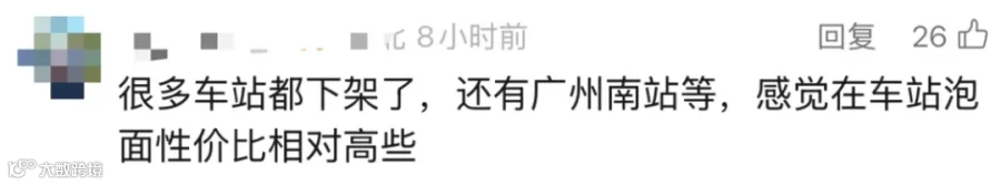 对此,广州东站回应称:原东站开行的普速列车已全部调整至广州站等其他车站,目前广州东站开行的均为动车组列车,根据国铁集团《铁路旅客运输服务质量规范》相关规定,方便面(泡面)属于可能严重影响列车环境卫生的食品。为维护高铁车站和列车环境卫生,使广大旅客享受到更为优质的服务,高铁车站内均不售卖方便面食品,但旅客可自行携带。不便之处,敬请谅解!