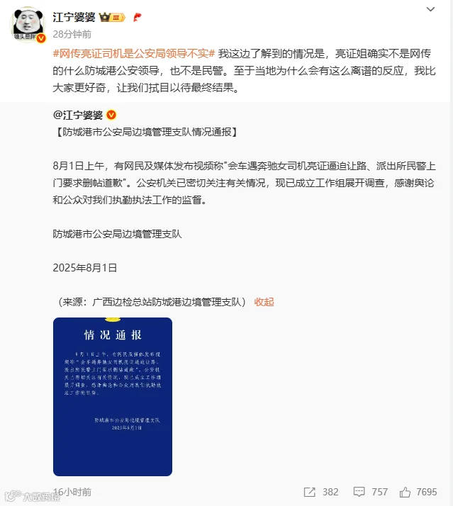 8月2日,有着500多万粉丝的知名网红民警、南京市江宁区民警@江宁婆婆 发文: 我这边了解到的情况是,亮证姐确实不是网传的什么防城港公安领导,也不是民警。至于当地为什么会有这么离谱的反应,我比大家更好奇,让我们拭目以待最终结果。