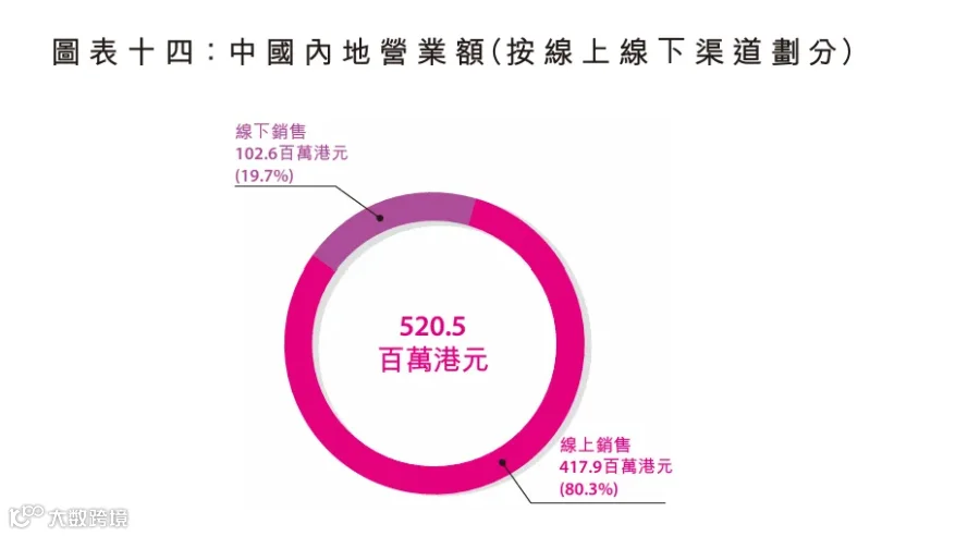 中国内地市场则呈现“线上强、线下弱”的分化格局。2024/25财年营业额同比下降10.5%至5.21亿港元,其中线上渠道占比80.3%,微增0.6%至4.18亿港元;线下渠道占比19.7%,暴跌38.2%至1.03亿港元。