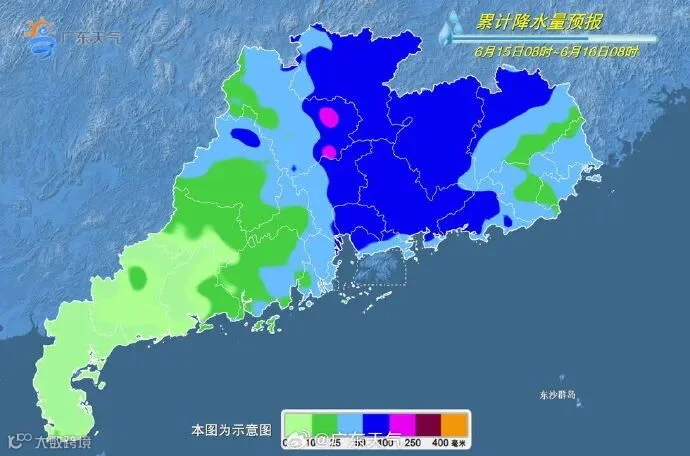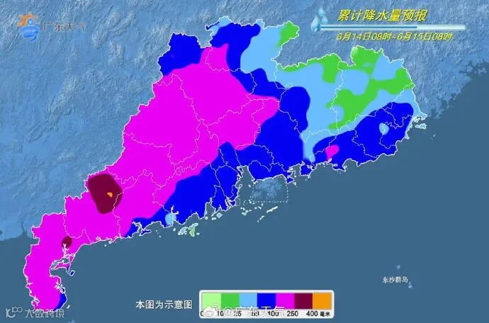 14日夜间到15日,粤西的北部、云浮、肇庆、韶关、清远、河源北部、粤东有暴雨到大暴雨,局部特大暴雨,其余市县有大雨局部暴雨。