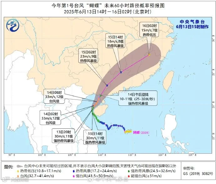 据最新预报,预计“蝴蝶”将以每小时10公里左右的速度向偏北方向移动,紧擦海南岛西部近海北上,之后将于6月14日中午前后在广东徐闻到广西北海一带沿海登陆,登陆时强度为强热带风暴级,登陆后转向东北方向移动,强度逐渐减弱。