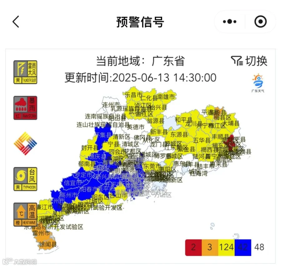 截至6月12日19时,湛江遂溪县、吴川市、雷州市、赤坎区、霞山区、坡头区、麻章区、东海岛经济开发试验区、廉江市、徐闻县,以及茂名电白区、茂南区、滨海新区、高新区,均启动台风黄色预警。