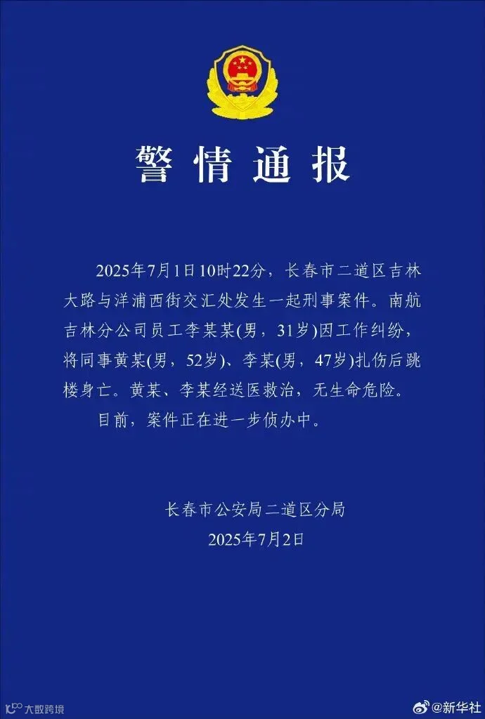 南航员工李某某(男,31岁)扎伤两同事后,跳楼身亡!警方通报→