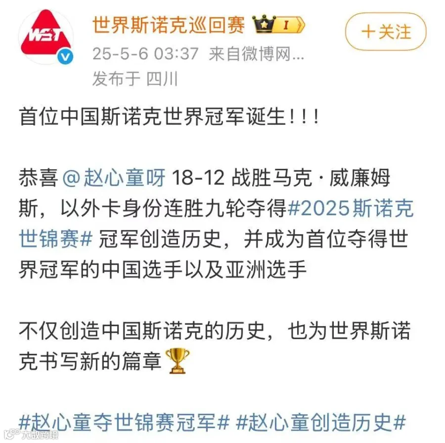 北京时间5月6日,斯诺克世锦赛决赛第四阶段比赛结束,中国选手赵心童总比分18比12战胜马克・威廉姆斯夺得冠军,成为中国首位,也是亚洲首位斯诺克世锦赛冠军,创造了斯诺克运动的历史。