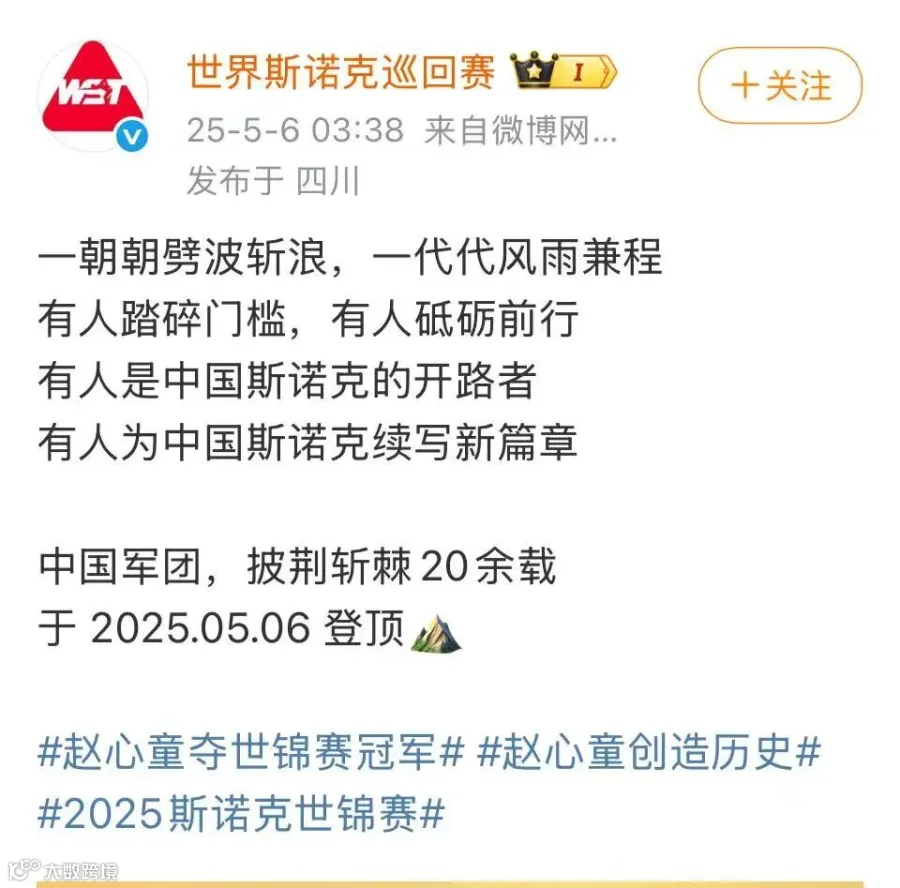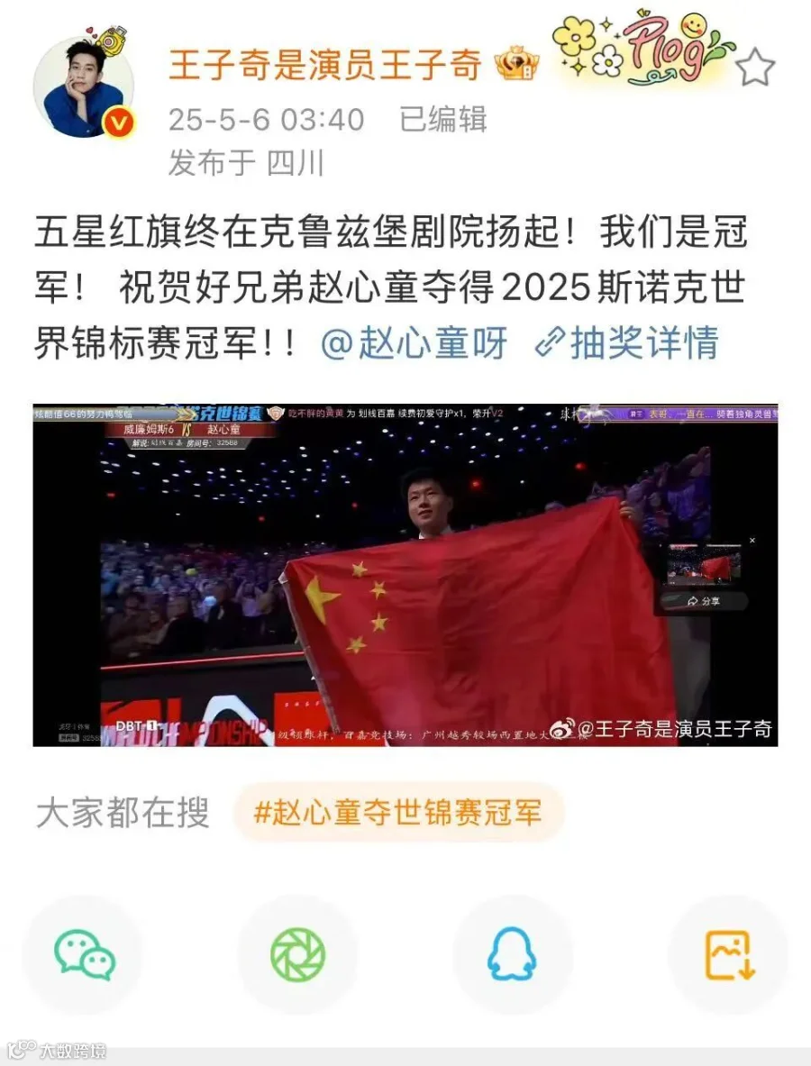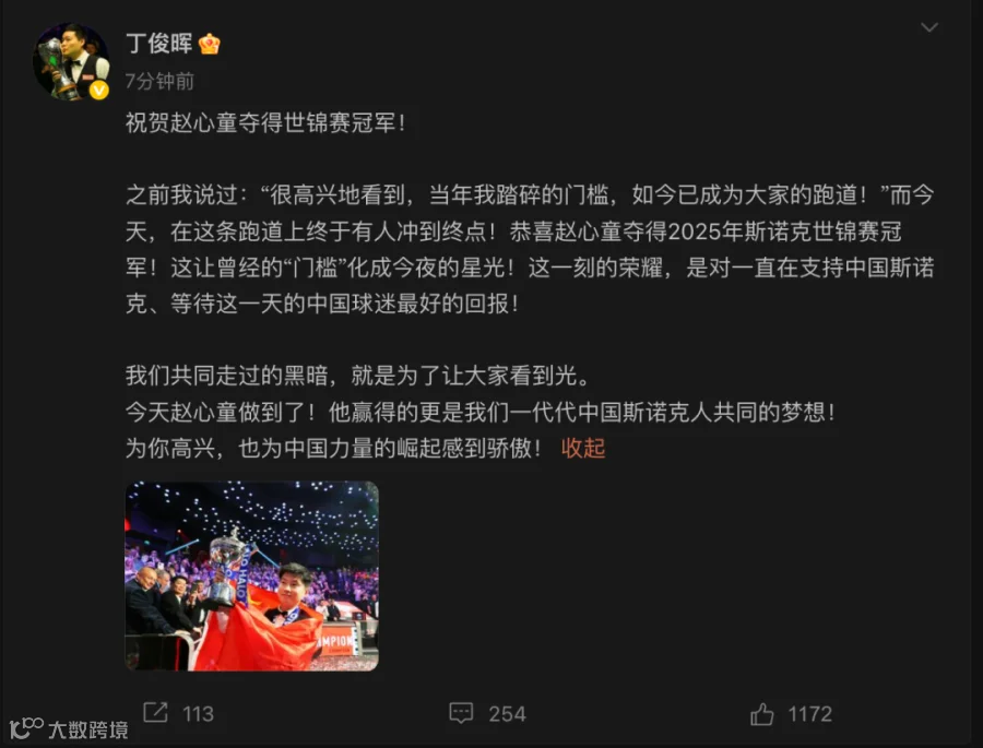 丁俊晖第一时间发文祝贺