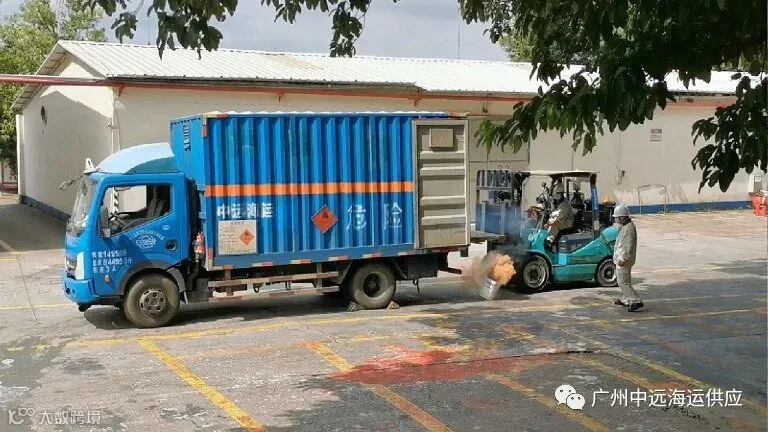 ▲ 在油漆货物装载过程中,由于托盘内的油漆稀释剂不慎从车上掉落发生泄漏起火。