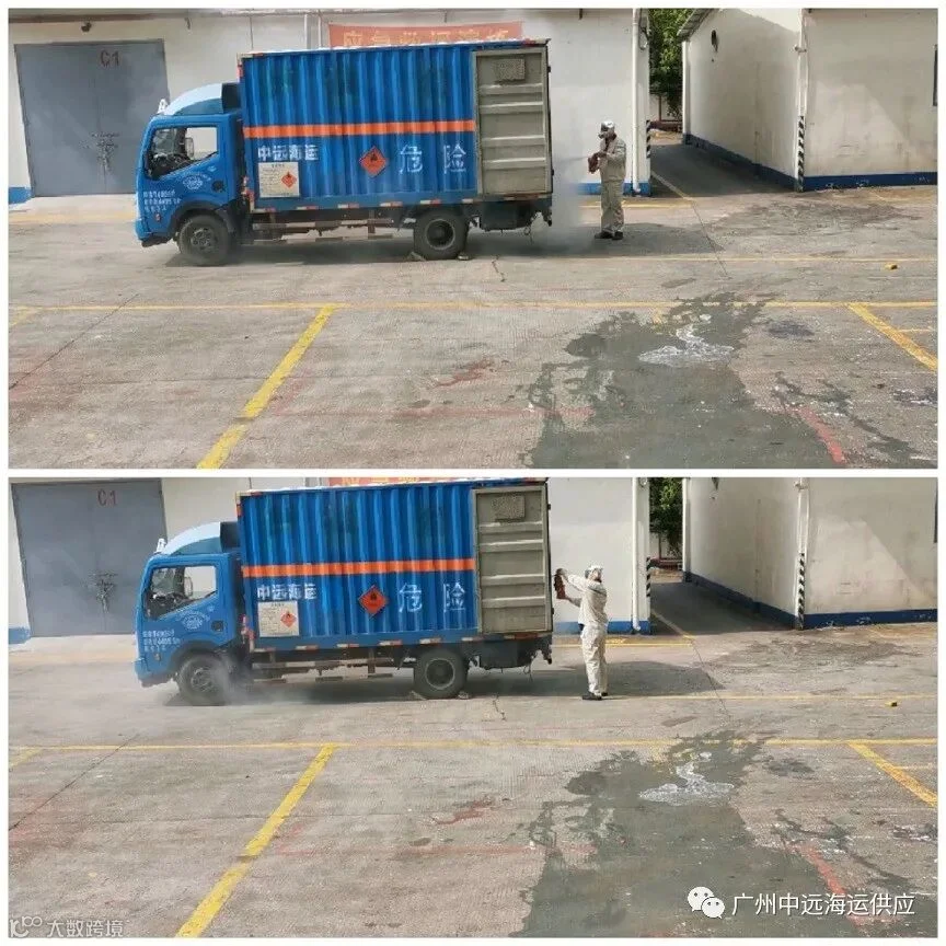 ▲ 货车开离现场后,司机和送料员迅速戴上防毒面具,取出灭火器进行扑救,尝试控制火势。