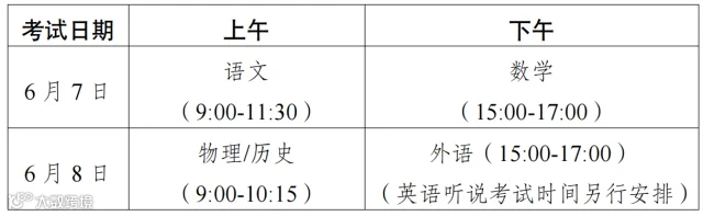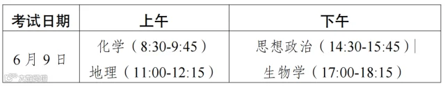 6月7日上午考语文,下午考数学;6月8日上午考物理、历史,下午考外语;6月9日上午考化学、地理,下午考思想政治和生物学。