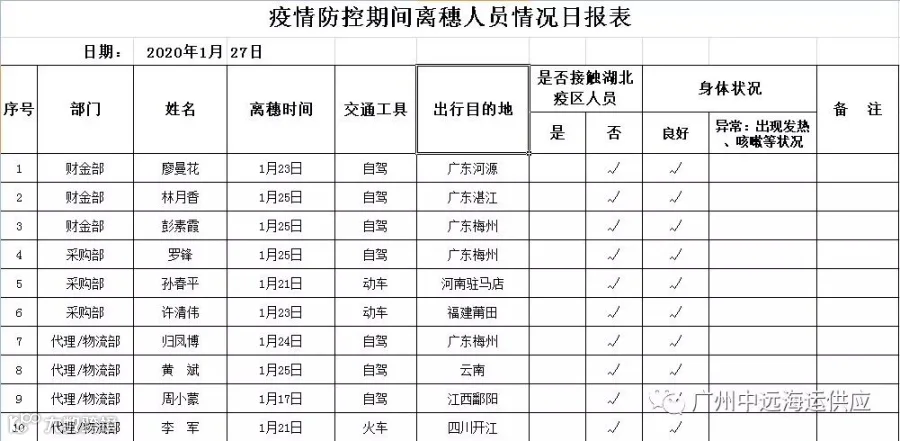 ▲积极落实特运防控部署,每天跟进各部门员工行程动态及身体状况,重点关注离穗人员状况。
