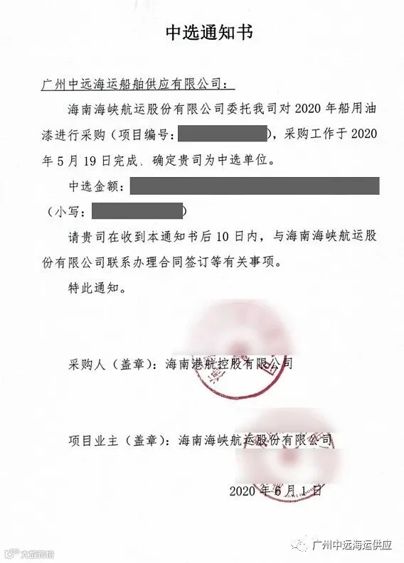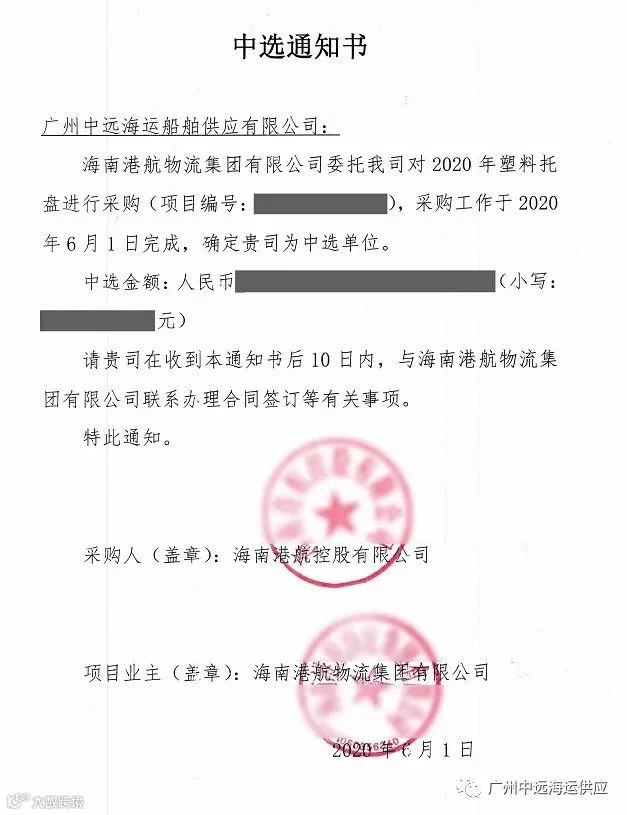 近日,公司在海南业务拓展项目上传来喜讯,继近期中选海南港航控股有限公司口罩等防疫物资供应业务后,又成功中选“2020年船用油漆采购项目”和“2020年塑料托盘采购项目”。