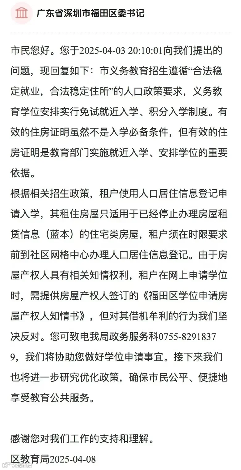 福田区教育局:租户在网上申请学位时,需提供房屋产权人签订的授权书,但坚决反对其借机牟利的行为。