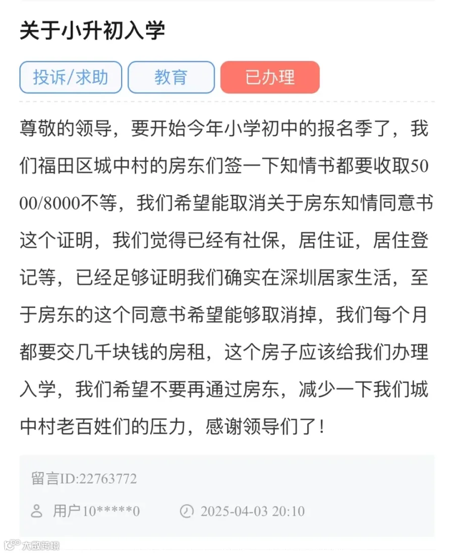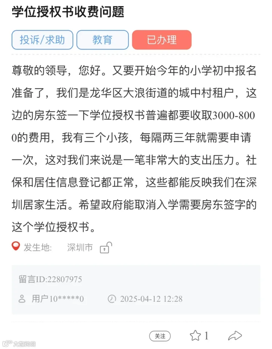 一位福田区家长也反映类似问题,称房东收取5000-8000元不等的签字费,建议用居住证、社保等材料替代授权书,减少租户负担。