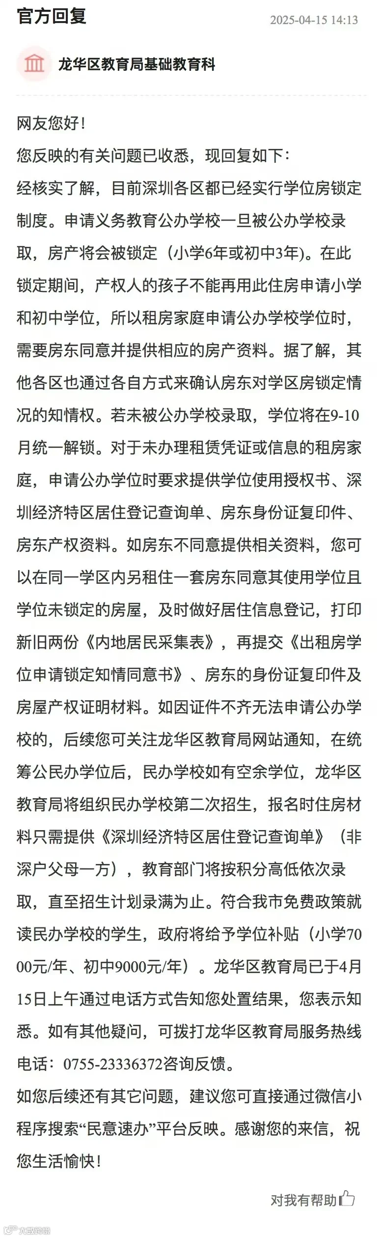 龙华区教育局基础教育科:学位授权书是为保障房东知情权,建议租户可以另寻合作房东或考虑民办学位补贴。