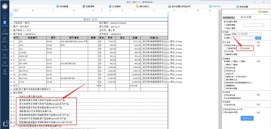 优化报表导出功能,报价说明增加“区分系列”选择,勾选则报价说明会增加说明元件使用具体系列