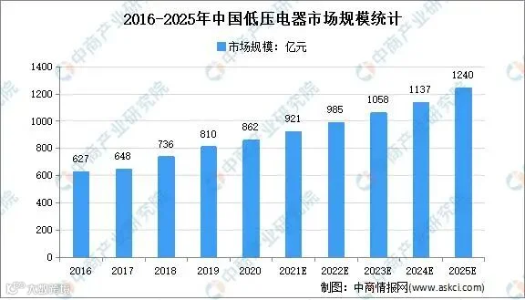 数据显示,我国低压电器市场规模从2016年的627亿元增长至2020年的862亿元,2020年较2019年增长52亿元,同比增长6.4%。预计2025年我国低压电器市场规模将达1240亿元。