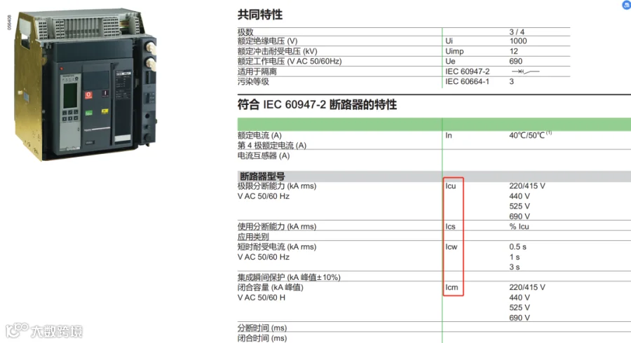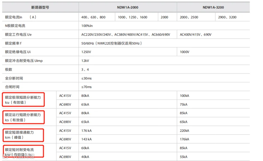 Icu:极限短路分断能力,是指在一定的试验参数(电压、短路电流、功率因数)条件下,经一定的试验程序,能够接通、分断的短路电流,断路器分断完极限短路分断能力的电流后,断路器就损坏了。