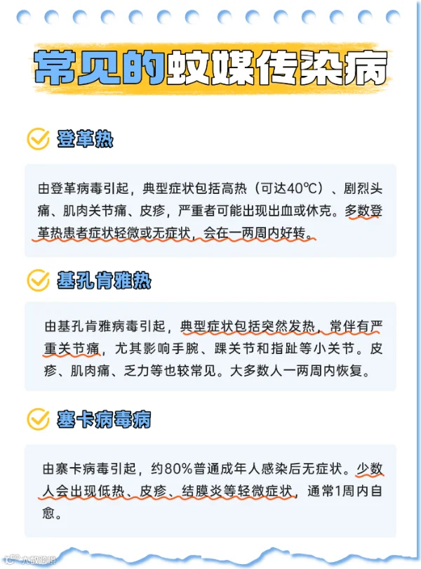 蚊媒传染病指的是通过蚊子叮咬传播病原体的疾病。其中,登革热、基孔肯雅热、寨卡病毒病,是三种常见病毒性蚊媒传染病,三者均主要由埃及伊蚊、白纹伊蚊叮咬传播,不会通过日常接触或呼吸道传染。