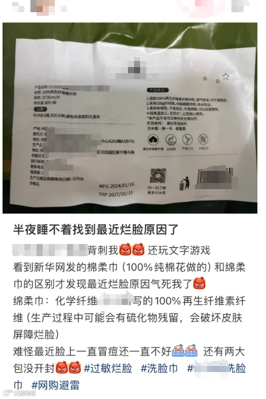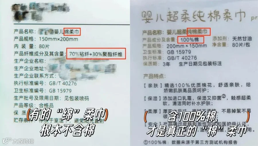 前段时间,江苏省消费者权益保护委员对50批次柔巾产品进行检测,检测报告显示:有9批次产品纤维名称和含量不符合标准要求。其中,7批次柔巾产品标注为100%植物纤维、再生纤维素纤维的“mian柔巾”,竟然一点都不含棉!