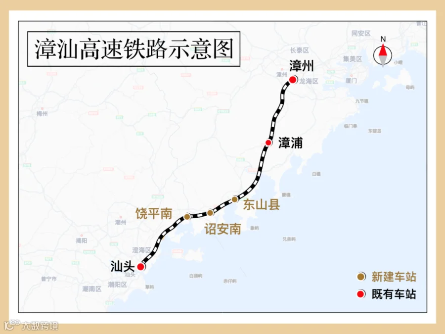 漳汕高铁是国家“八纵八横”高速铁路网沿海通道的重要组成部分,线路起自福厦高铁漳州站,经福建省漳州市,广东省潮州市、汕头市,接入汕头站,线路全长约175公里,设计时速350公里,建设工期4.5年,预计2028年建成。