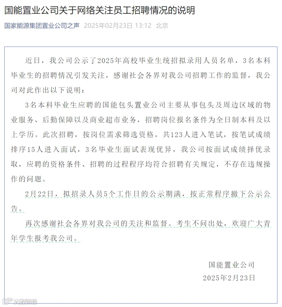 国能置业公司表示,3名本科毕业生应聘的国能包头置业公司主要从事包头及周边区域的物业服务、后勤保障以及商业超市业务,招聘岗位报名条件为全日制本科及以上学历。此次招聘,按岗位需求筛选资格,共123人进入笔试,按笔试成绩排序15人进入面试,3名毕业生面试表现优异,该公司按面试成绩择优录取,应聘的资格条件、招聘的过程程序均符合招聘有关规定,不存在违规操作的问题。2月22日,拟招录人员5个工作日的公示期满,按正常程序撤下公示公告。