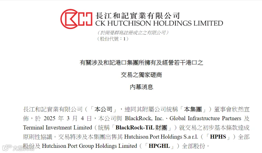 3月4日深夜,李嘉诚旗下长江和记实业有限公司(00001.HK)在港交所公告,宣布与贝莱德(BlackRock)牵头的财团达成原则性协议,出售其全球港口业务核心资产,其中涉及巴拿马港口公司90%股权。