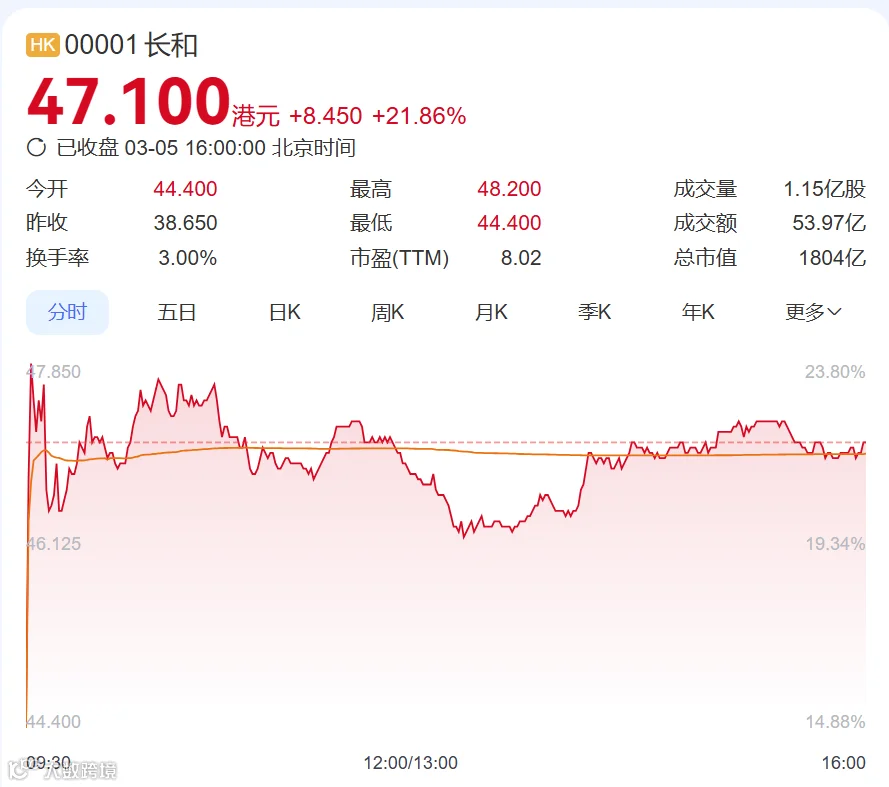 受上述消息影响,3月5日,长和股价大涨,截至收盘,涨幅为21.86%,总市值为1804亿港元。