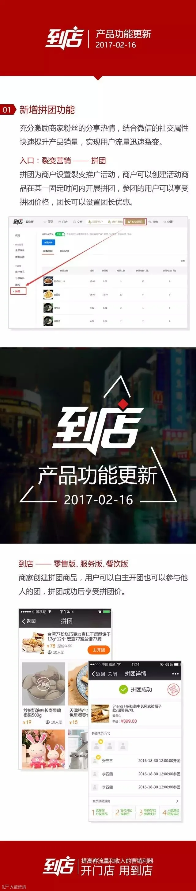 导读:本周到店更新:零售版、服务版、餐饮版,新增“拼团”功能。