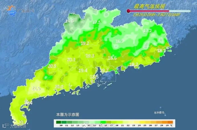 28日,我省西北部市县阴天到多云,有分散小雨,其余市县多云间阴天。早晨大部分陆地和粤西海面有(轻)雾。早晨最低气温:粤北市县12~14℃,粤西市县16~18℃,其余市县14~16℃。