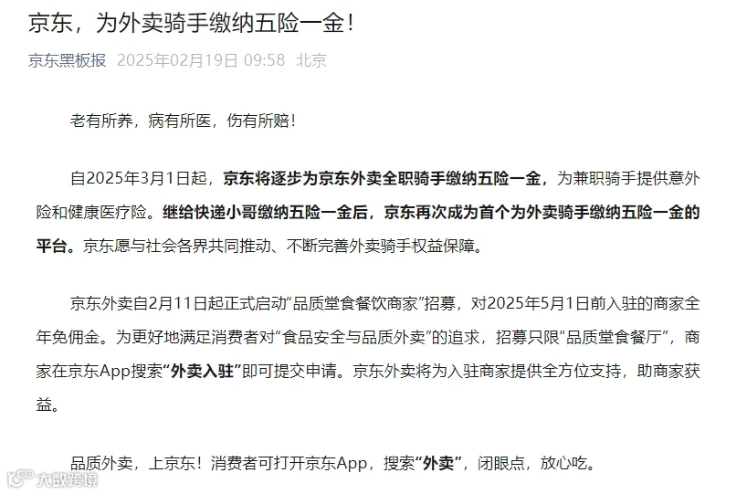 将逐步为京东外卖全职骑手