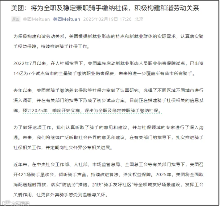 该文还提到,2025年,美团将全面取消配送超时罚款,落实“防疲劳”措施,加快“骑手友好社区”等全领域友好场景建设,发挥工会关爱作用,让更多外卖骑手感受到温暖与关怀。
