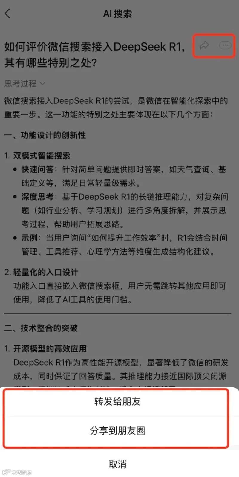 根据实测网友展示,目前微信内应用DeepSeek-R1后,回答引用的内容包含微信公众号文章、网页消息等,答案可一键分享至朋友圈或群聊,形成“提问-获取-分享”的社交化信息流转。