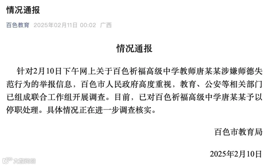 已对百色祈福高级中学唐某某予以停职处理。具体情况正在进一步调查核实