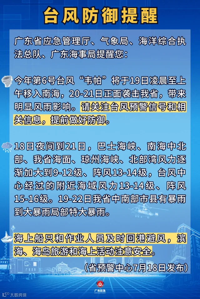 今年第6号台风“韦帕”正在以每小时20-25公里的速度向西偏北方向移动,强度逐渐增强,预计将于7月19日凌晨移入南海,逐渐向广东省中西部一带沿海靠近,并将正面袭击广东。鉴于台风“韦帕”发展趋势及对广东省影响,根据《广东省防汛防旱防风防冻应急预案》和省防总有关规定,广东省防汛防旱防风总指挥部已于7月18日18时启动防风Ⅳ级应急响应。