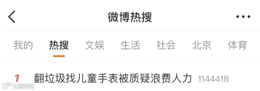消息发出后,网友质疑该行为没有必要,话题“翻垃圾找儿童手表被质疑浪费人力”冲上热搜第一。