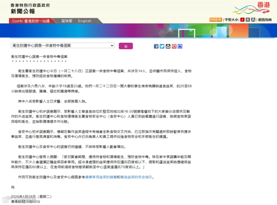 受影响的14人曾于1月22日进食盆菜