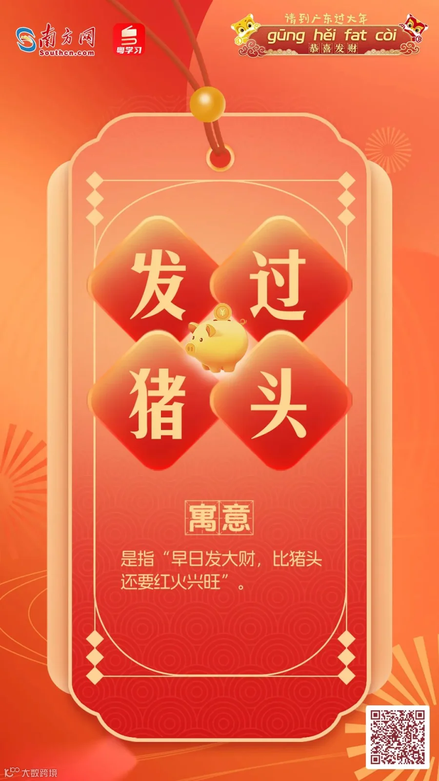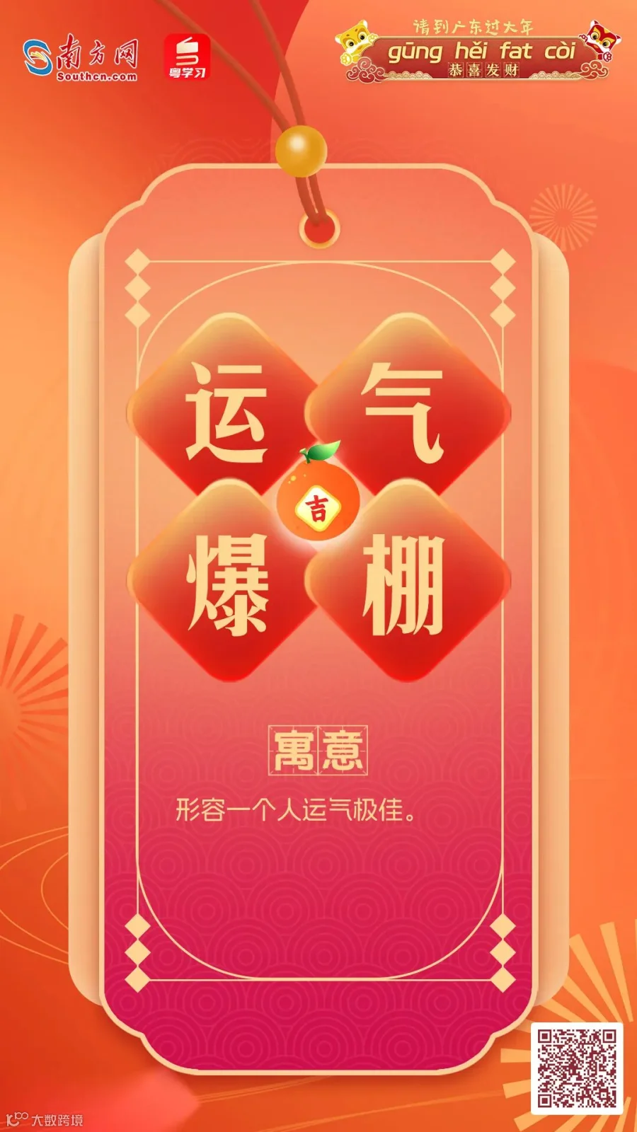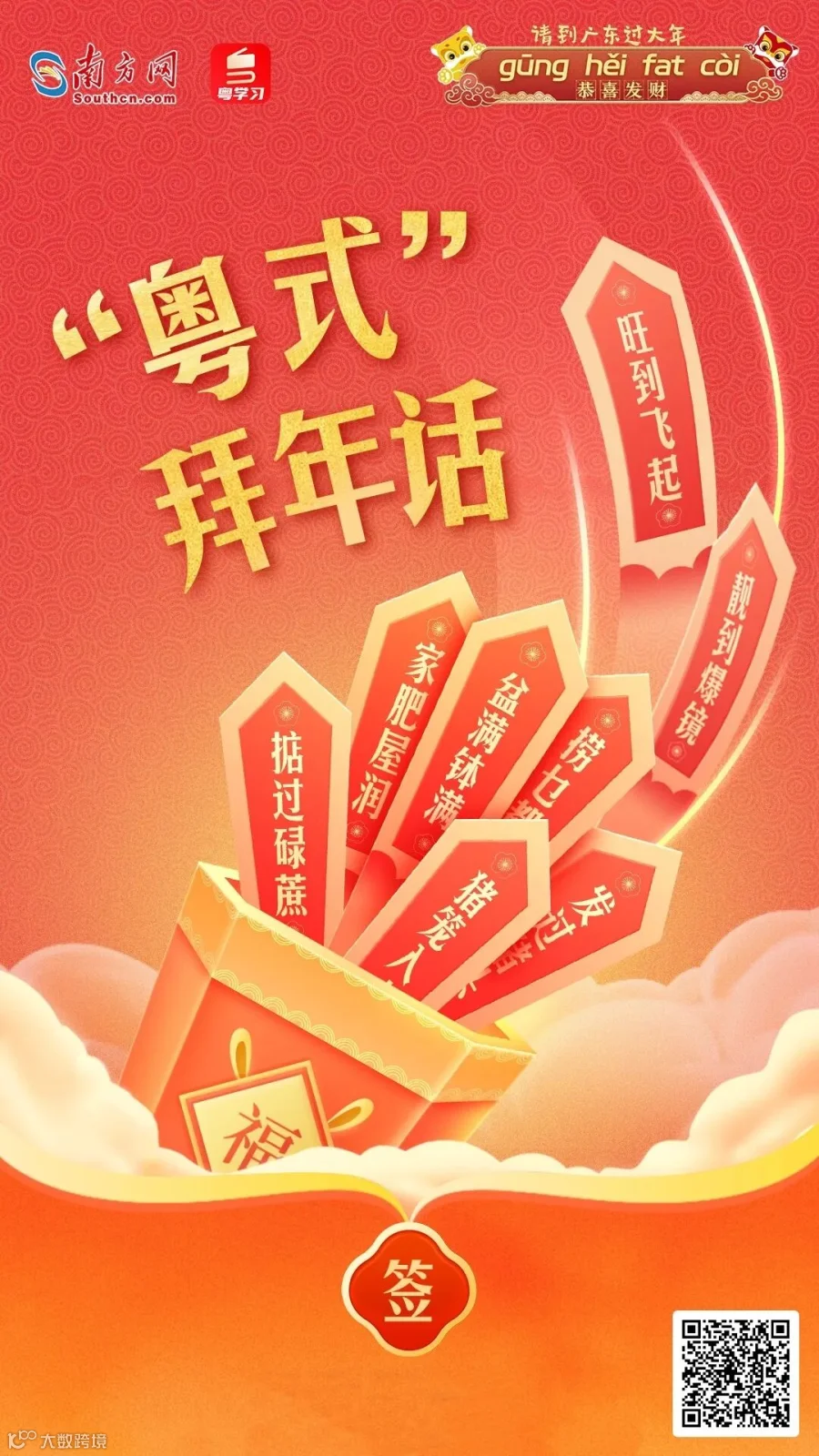 在广东,拜年话更是具有地方特色,春节期间最常能听到便是那句——“恭喜发财,利是㨮来”。南方君制作了几款“粤式”拜年话海报,快来选一张您喜欢的吧~