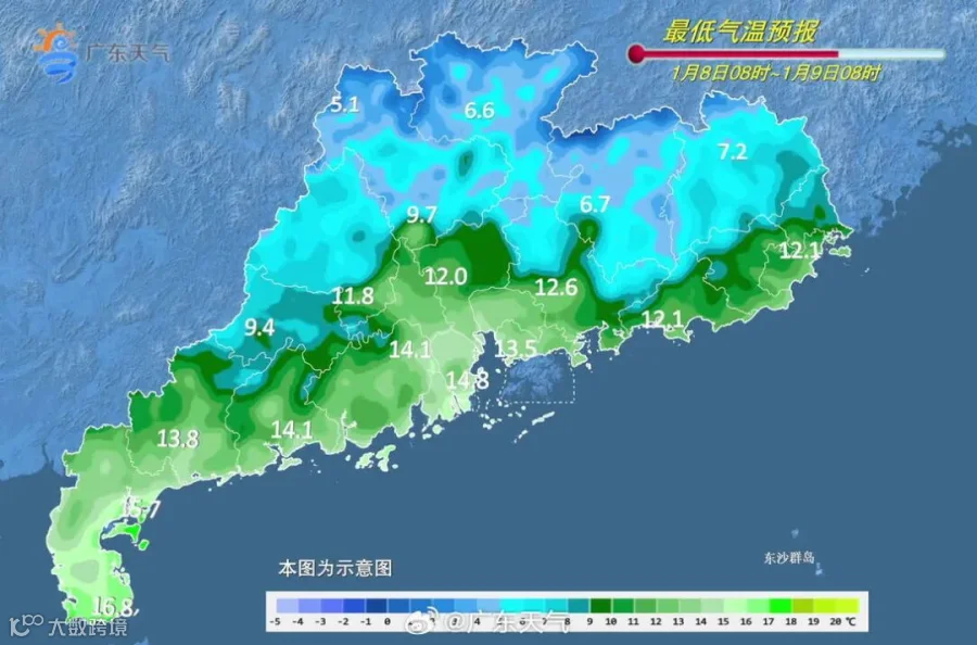 9日,广东大部多云或多云到阴天,部分市县有零星小雨。最低气温:粤北、珠三角北部市县介于4~8℃,南部沿海市县11~14℃,其余市县9~10℃。