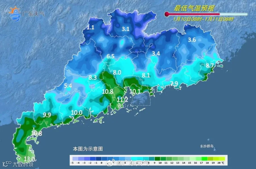 10日,广东大部多云转晴。最低气温:粤北大部分市县介于1~5℃,高寒山区-2~0℃,有冰冻和霜冻,沿海市县10~13℃,其余市县6~9℃。