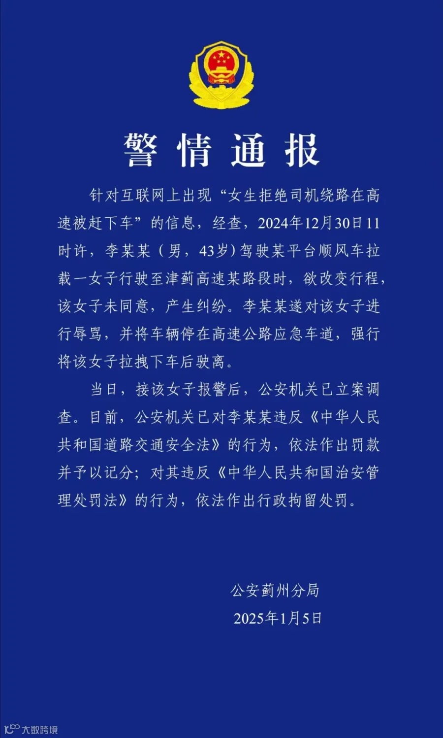 1月5日晚,天津市公安局蓟州分局通报“女生拒绝司机绕路在高速被赶下车”:目前,公安机关已对李某某违反《中华人民共和国道路交通安全法》的行为,依法作出罚款并予以记分,对其违反《中华人民共和国治安管理处罚法》的行为,依法作出行政拘留处罚。