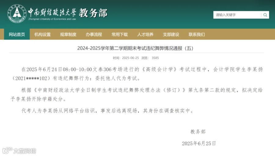 6月24日,有网友在社交平台上发帖称,湖北武汉中南财经政法大学某场考试中一男子着女装替考,引发网友热议。