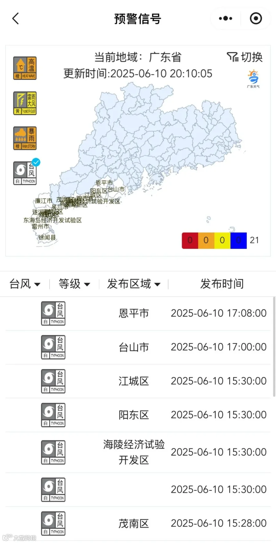 截至10日20时10分,广东恩平、台山、廉江等21地已发布台风白色预警信号。